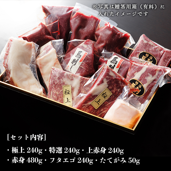 舌の上でとろける脂の甘みを堪能できる[極上霜降り]、サシと赤身のバランスがとても良く、脂と赤身の良い部分を同時に楽しめる[特選霜降り]、馬肉本来の旨味を堪能できる[上赤身]、旨味と甘味が楽しめる[赤身]の他、希少部位のフタエゴ、たてがみをセットにした高級馬刺しのおいしさを心ゆくまで体験できる、プレミアムなセットです。