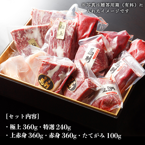 舌の上でとろける脂の甘みを堪能できる[極上霜降り]、サシと赤身のバランスがとても良く、脂と赤身の良い部分を同時に楽しめる[特選霜降り]、馬肉本来の旨味を堪能できる[上赤身]、旨味と甘味が楽しめる[赤身]の他、希少部位のたてがみをセットにした高級馬刺しのおいしさを心ゆくまで体験できる、プレミアムなセットです。
