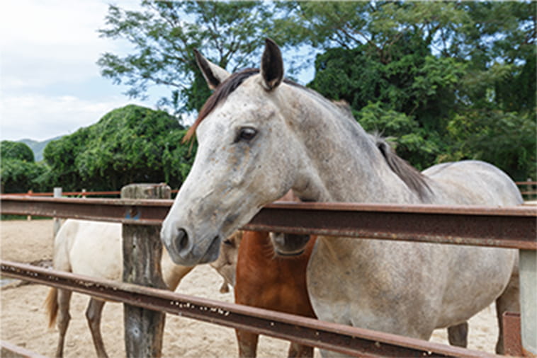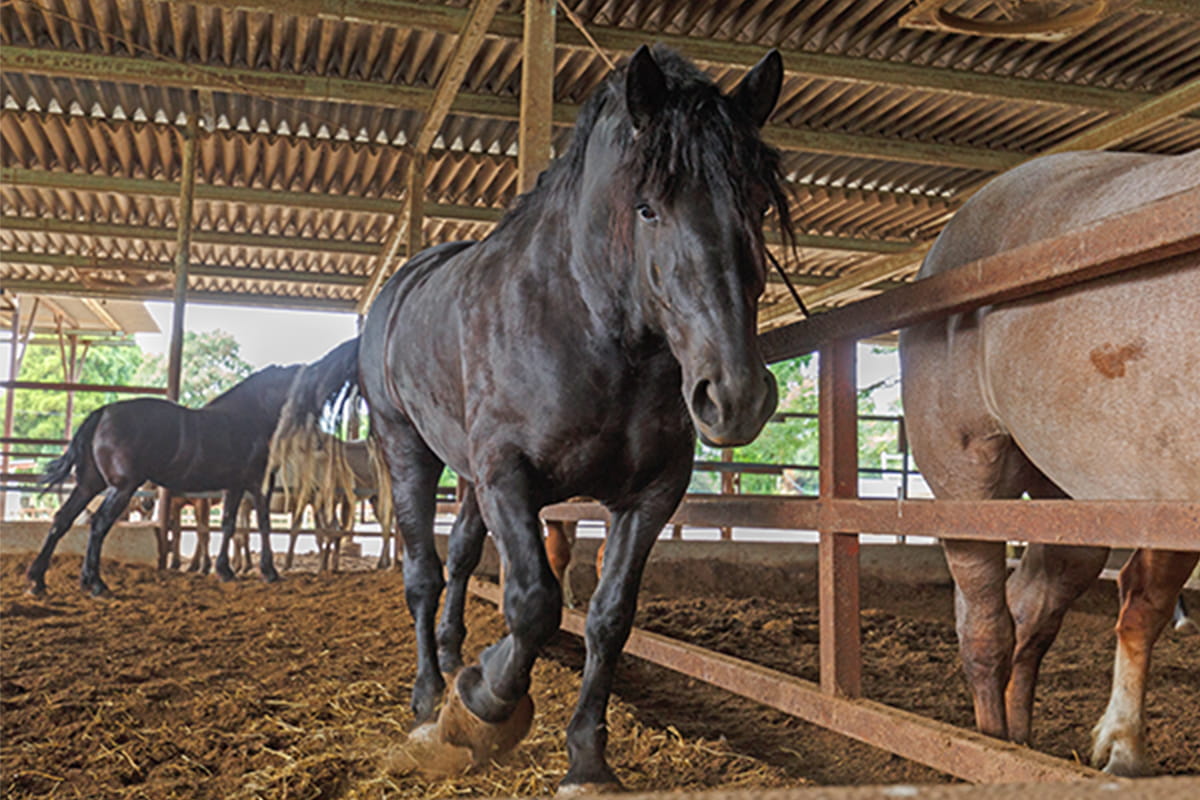 ストレス軽減のために、放牧出来る広い敷地を熊本県に用意。約2年の歳月をかけて自分の子どもを育てるようにゆっくり、のんびりと肥育しています。南関町の牧場では、馬は放牧をし、ストレスの少ない環境でのびのびと飼っています。熊本県の美味しい水、こだわって配合した自社開発の特別な飼料、豊富な牧草を食べて元気に育ちます。